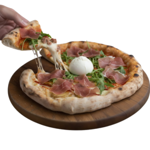 Una pizza para lucirse. Base de salsa de tomate aromatizada y mozzarella, coronada con jamón ibérico y ese toque irresistible de queso trufado. Los pomodorini aportan frescura, el aceite de romero perfuma cada bocado y la rúcula le da el contraste final perfecto.